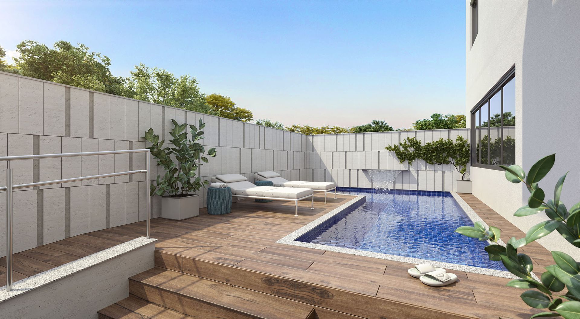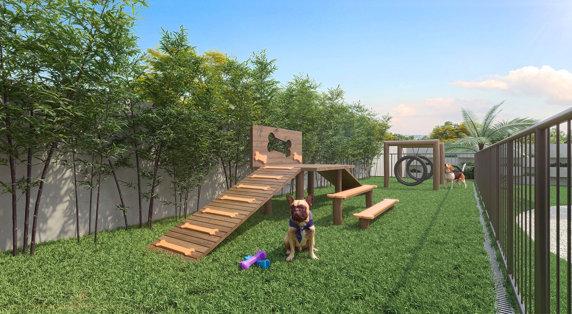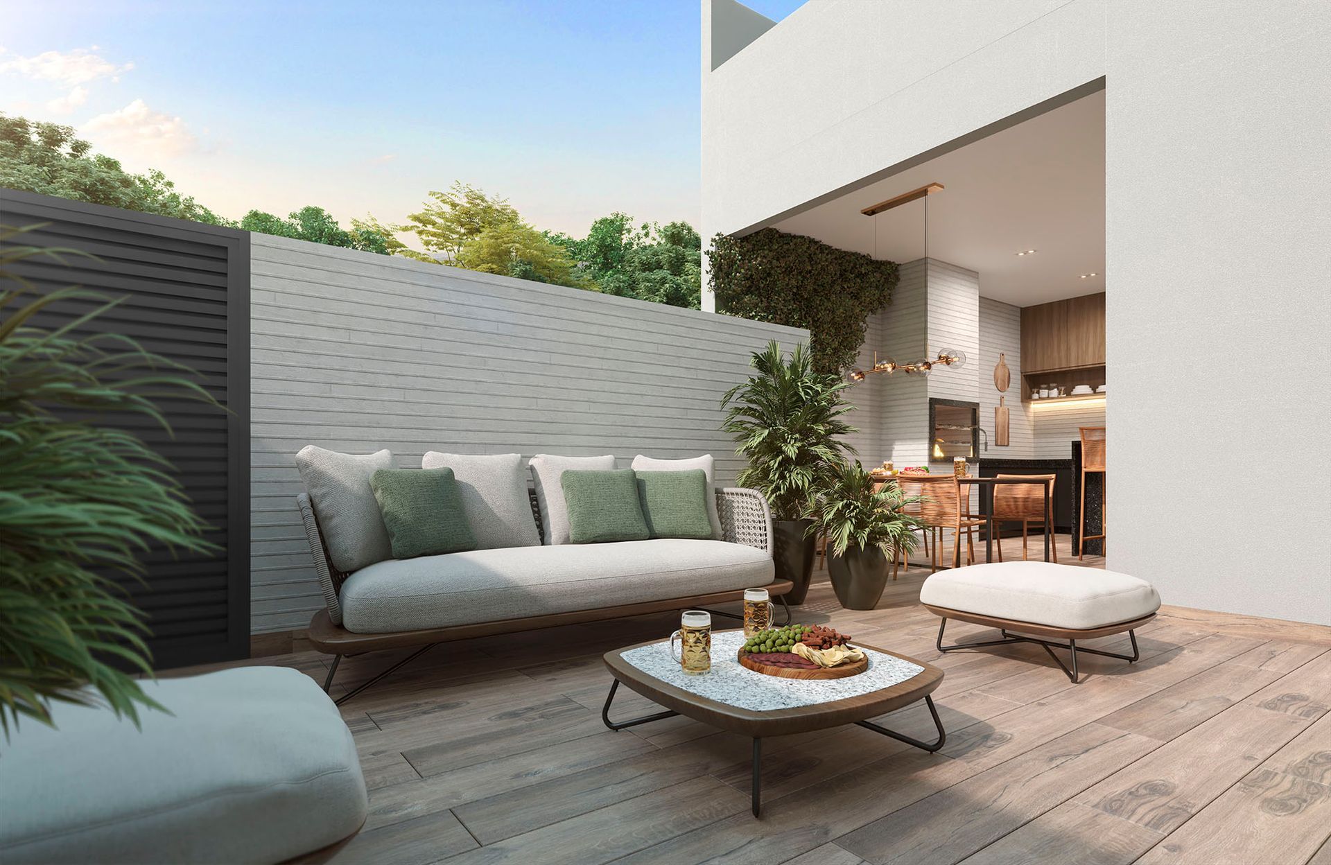 Área verde de 216 m² contemplada com horta vertical, pés de jabuticaba adultos, espaço para pets e espaços contemplativos.
